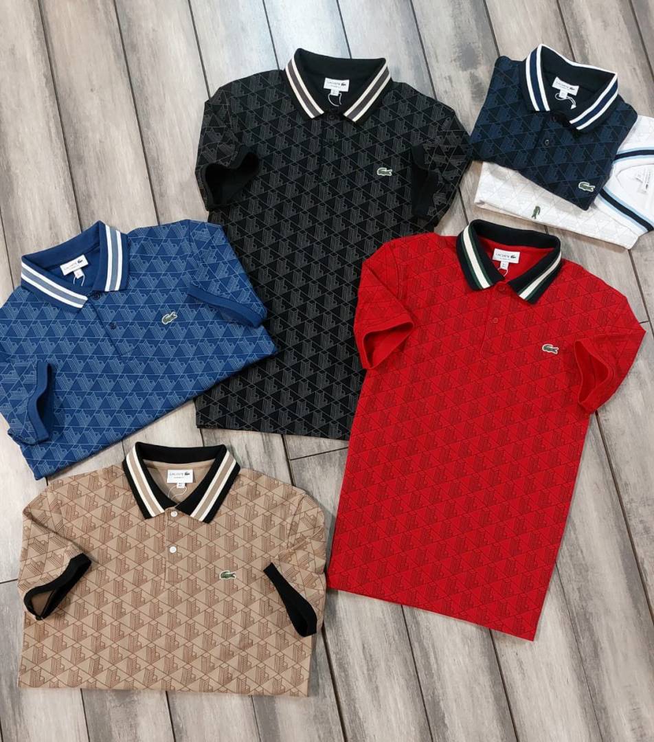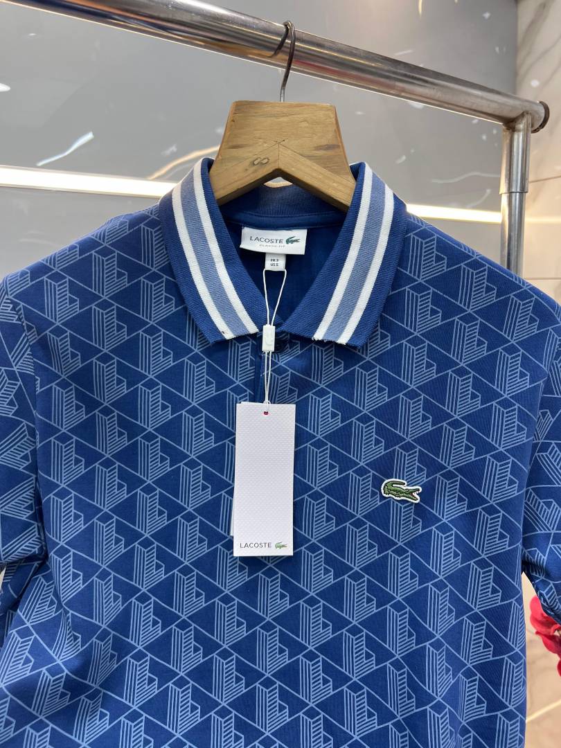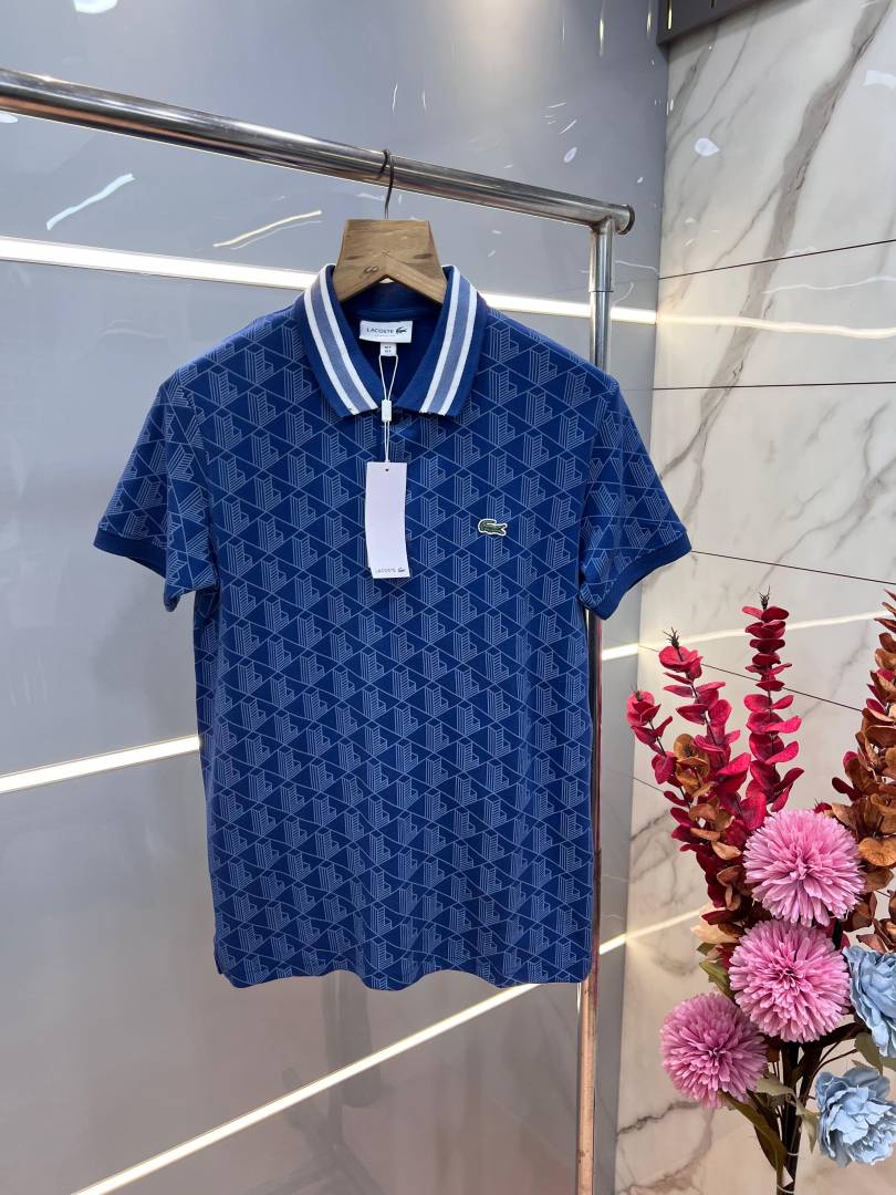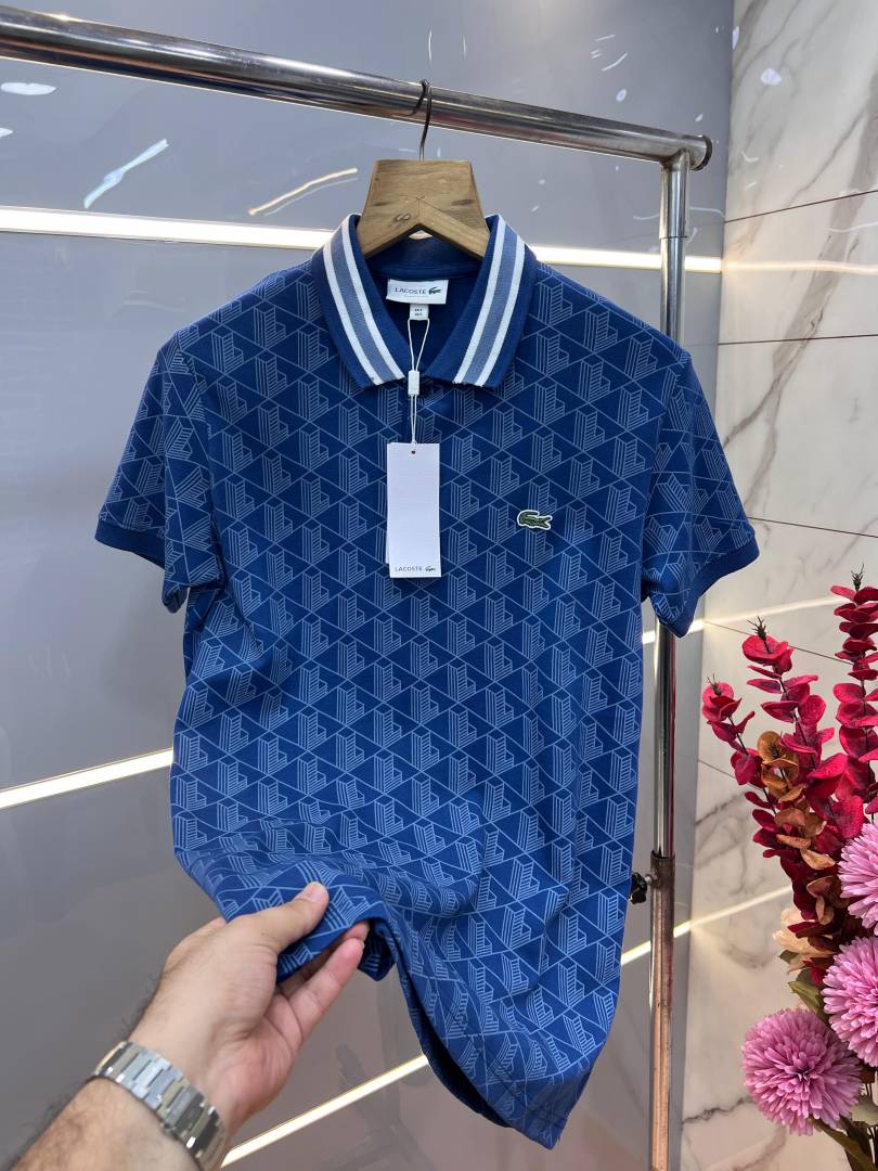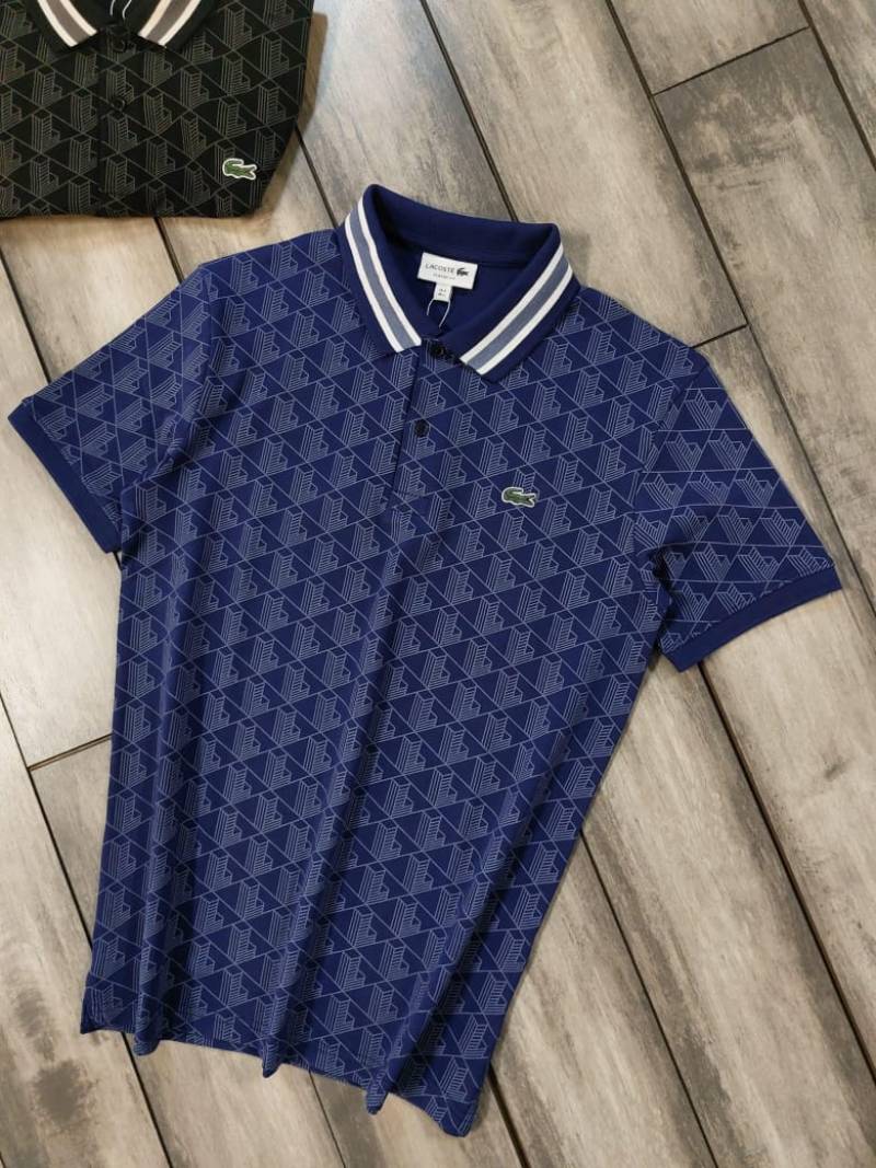 Lacost e Blue Premium 240 gsm interlock compact cotton fabric Polo Tshirt with Allover Monogram Print Collar Design and Embroidered Logo 3591